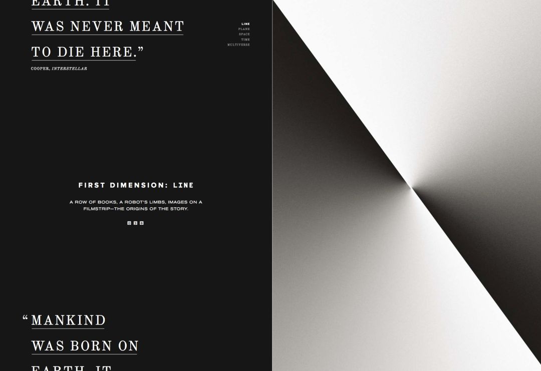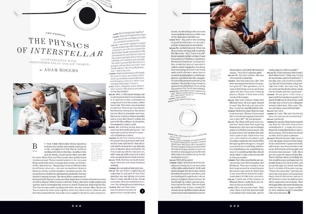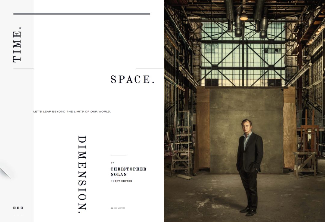 通篇采用的字体(Gotham)刚好与蝙蝠侠的家乡同名;读者需要在中途把杂志旋转90度才能继续阅读突然横向排列的文字;诺兰和《星际穿越》的科学总监的访谈通过扭曲的排版被“虫洞”连接在一起。