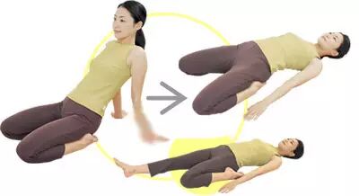 2:双腿呈正座姿势,两手向后撑地。运用腹式呼吸慢慢向后躺下直至贴近地板,两手自然放在身体两侧。
