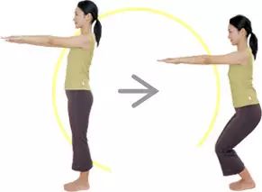 1:笔直站立,手臂向前伸出。保持上半身笔直,曲膝下蹲并坚持一段时间再恢复站立姿势。重复此动作5次。