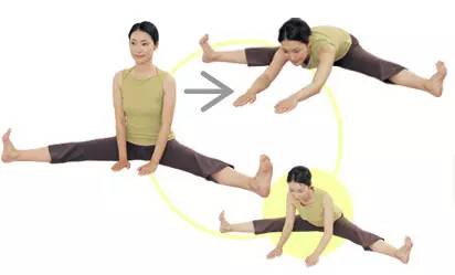 1:两腿张开至最大限度,脚尖向上绷直,两手向前伸直放在身体前侧。深吸一口气并慢慢将上半身前倾并坚持片刻,吸气再恢复到原始姿势。重复此动作20次。