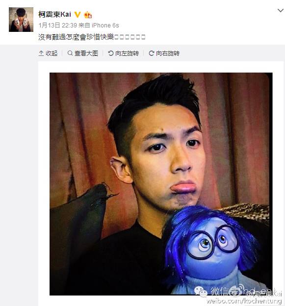 2016年1月13日 柯震东在脸书上PO出一张自拍照,照片中还合成了《头脑特工队》角色“忧忧”的图,并写道:“没有难过怎么会珍惜快乐。”似乎因为最近好友王大陆的解约风波而感到疲乏。