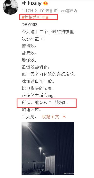 该账号开通于1月5日,此后便每天更新一则井柏然的剧组故事,并加上“DAY001 、002、003……”的字样,看样子该账号的归属权确实是井柏然,应该是剧组为了宣传而特意给井柏然开通的角色账号。而井柏然的工作室也已经认领了这个账号。