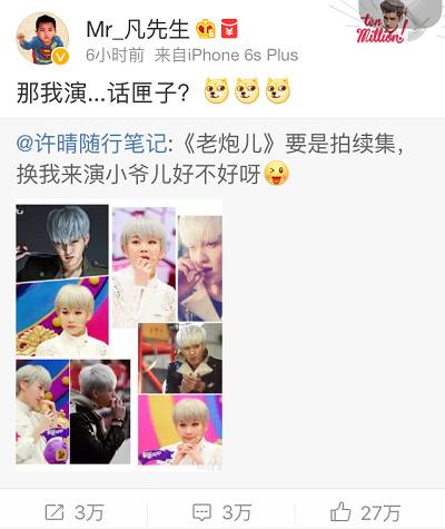许晴昨天晒了自己白毛短发照片,还附上了和吴亦凡的对比:“《老炮儿》要是拍续集,换我来演小爷儿好不好呀”。