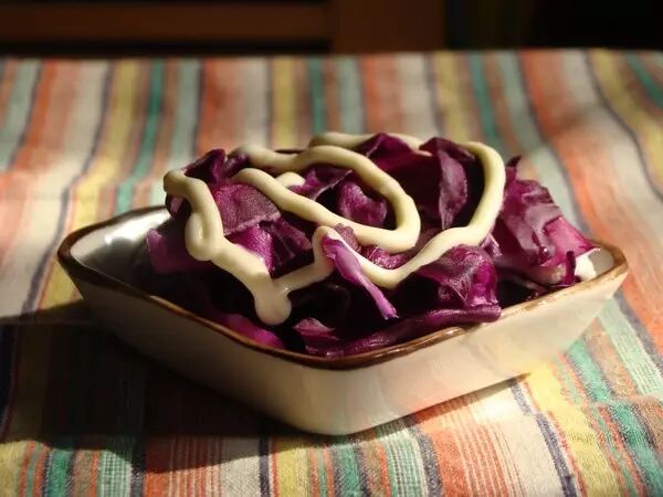 紫甘蓝生吃做沙拉最好,因其微有些苦味,故最好切成小块或丝状,再混以其它做沙拉常用的水果、蔬菜、沙拉酱即可。