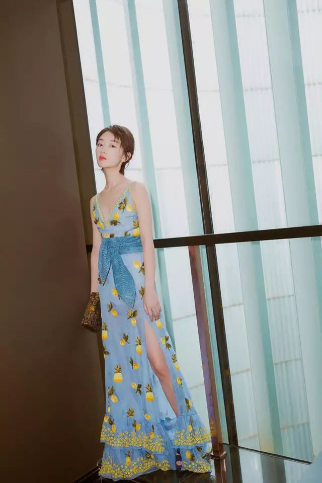 前不久周冬雨就以一席淡蓝色缀满菠萝的长裙清新亮相,获得一致好评。这样淡雅的颜色将周冬雨皮肤衬托地更加白皙光洁,清爽十足的柠檬又增添不少活力。