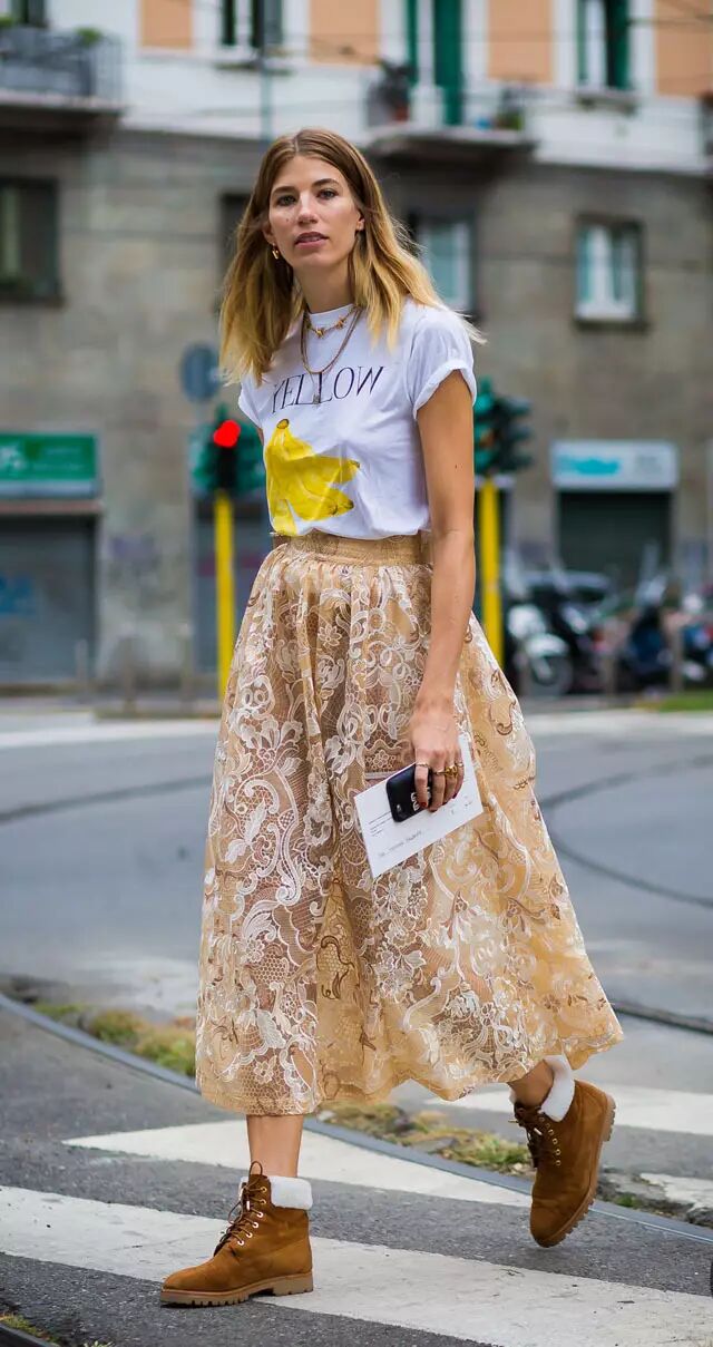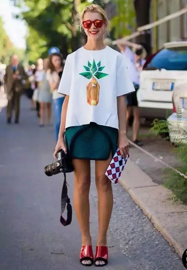 T恤加水果半裙半裙,不光是时髦度够高,如此简单的搭配方式还有显高显瘦的效果呢。