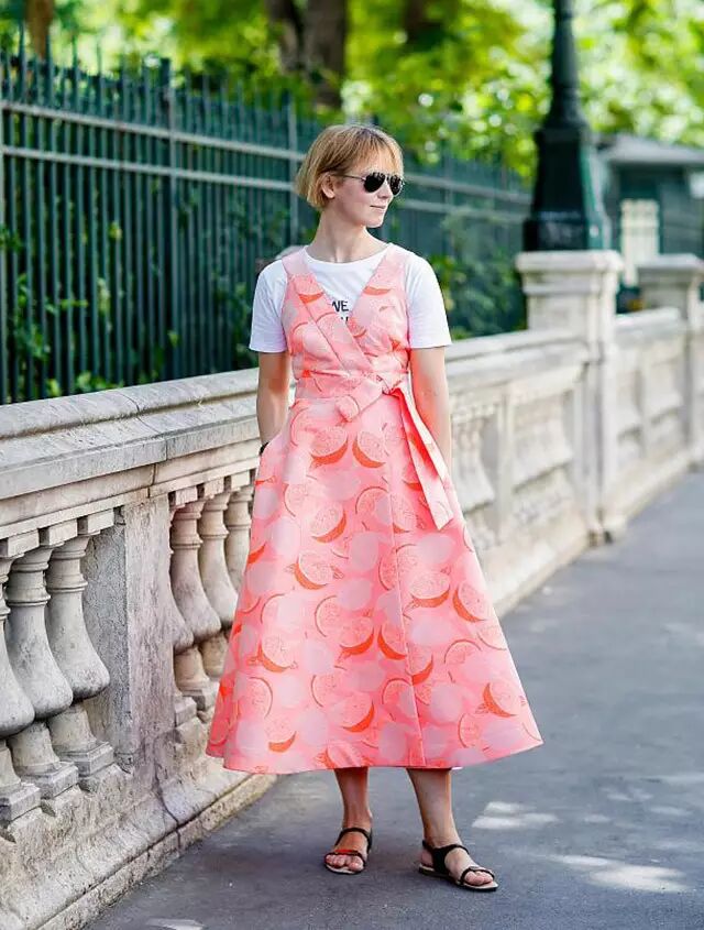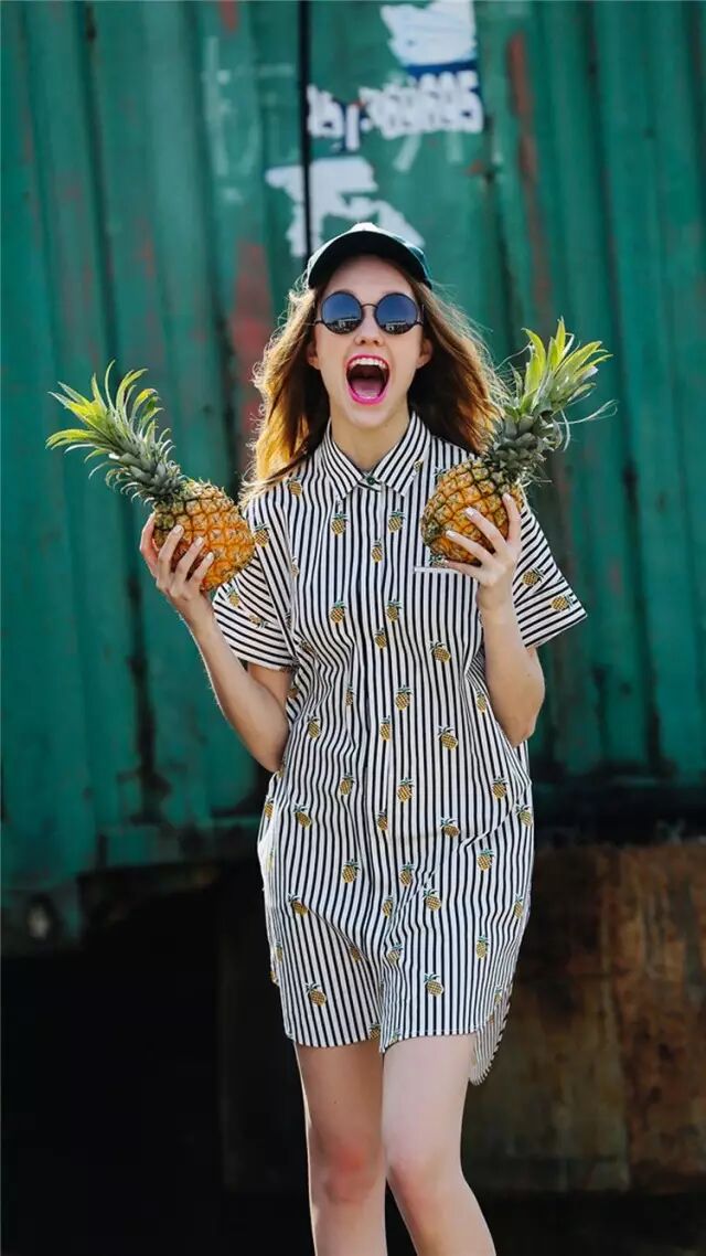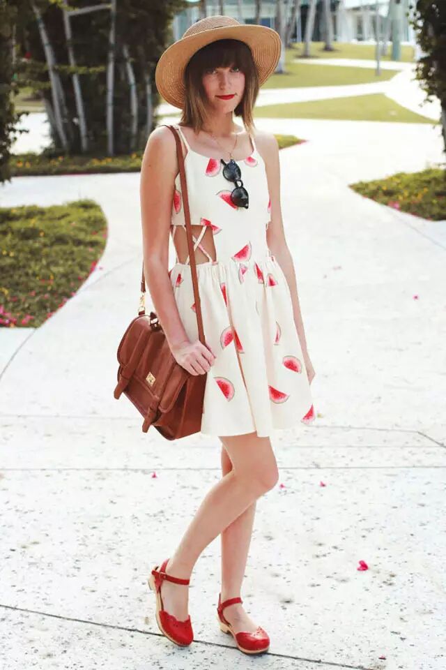 如果觉得连衣裙有些过于五彩缤纷,也可以选择局部有水果的衣服,简单别致又好搭。