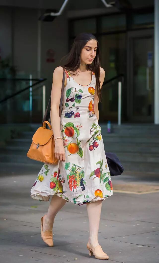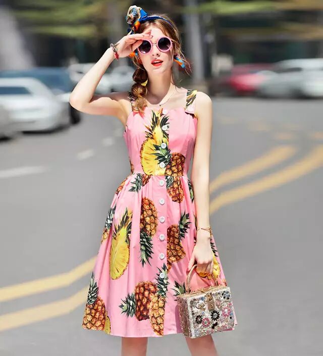 绚丽的水果印花连衣裙相比普通连衣裙更多了一份少女的活泼与俏皮,元气十足。