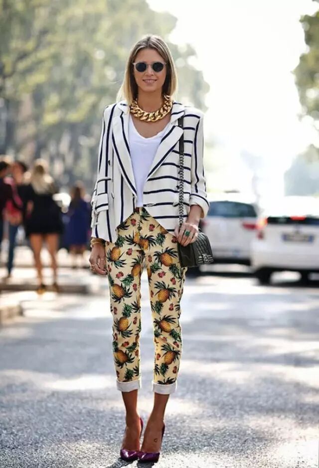 上身是简单白t和西装外套,下身就穿上鲜艳的水果裤吧!让你在夏日街头成为一道靓丽的风景线。