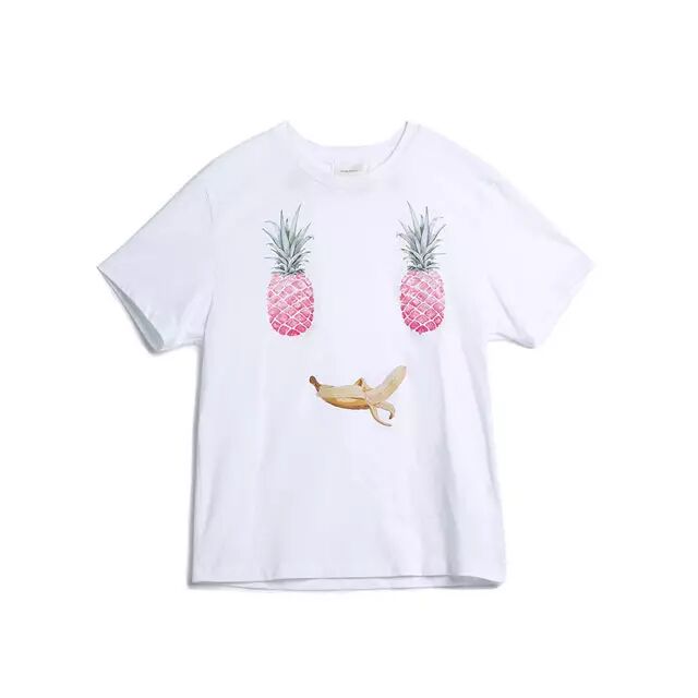 Ganni的白t真是简单又好搭,穿上它马上变得元气满满起来。这款印有各种水果的T恤在去年非常火热,不光是时尚达人喜欢穿,很多明星也都争着把它们穿上身。