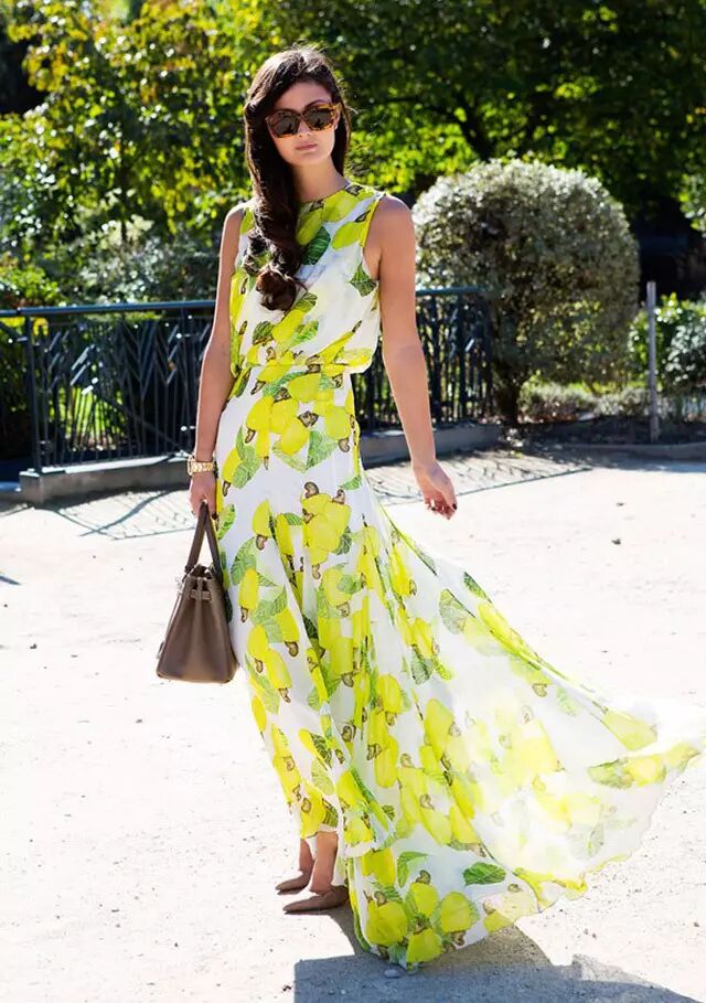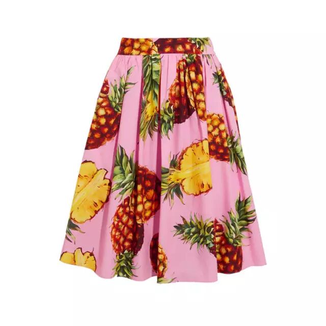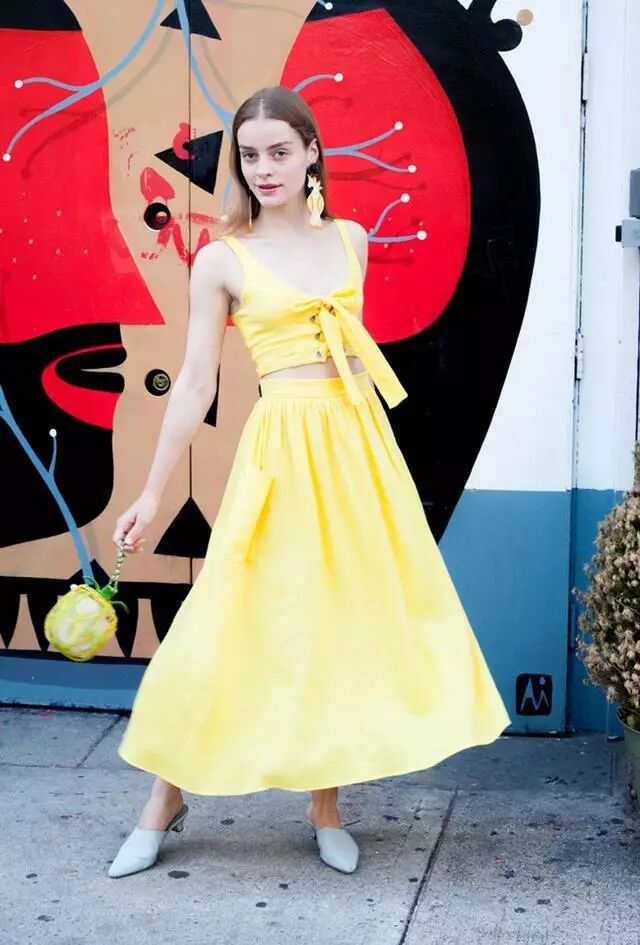 这种设计的裙子可以在视觉上起到拉长腰线的效果,同时柠檬的图案又为夏日增添一丝清凉气息。