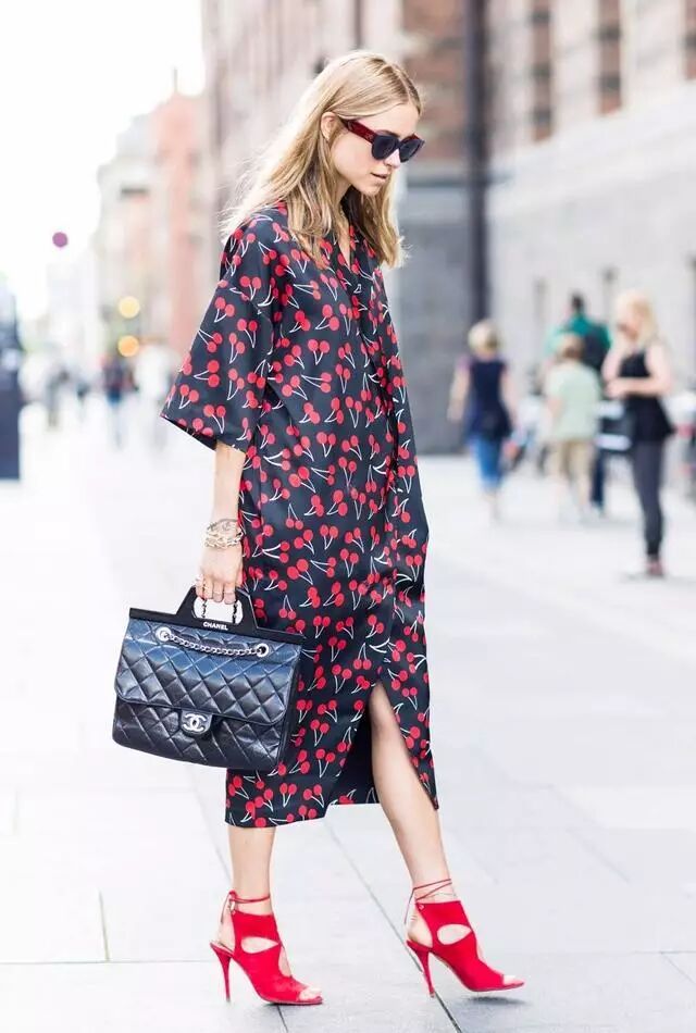 小水果的印花不仅显瘦,加在原本有些沉重的黑色底裙上,显得优雅又减龄。