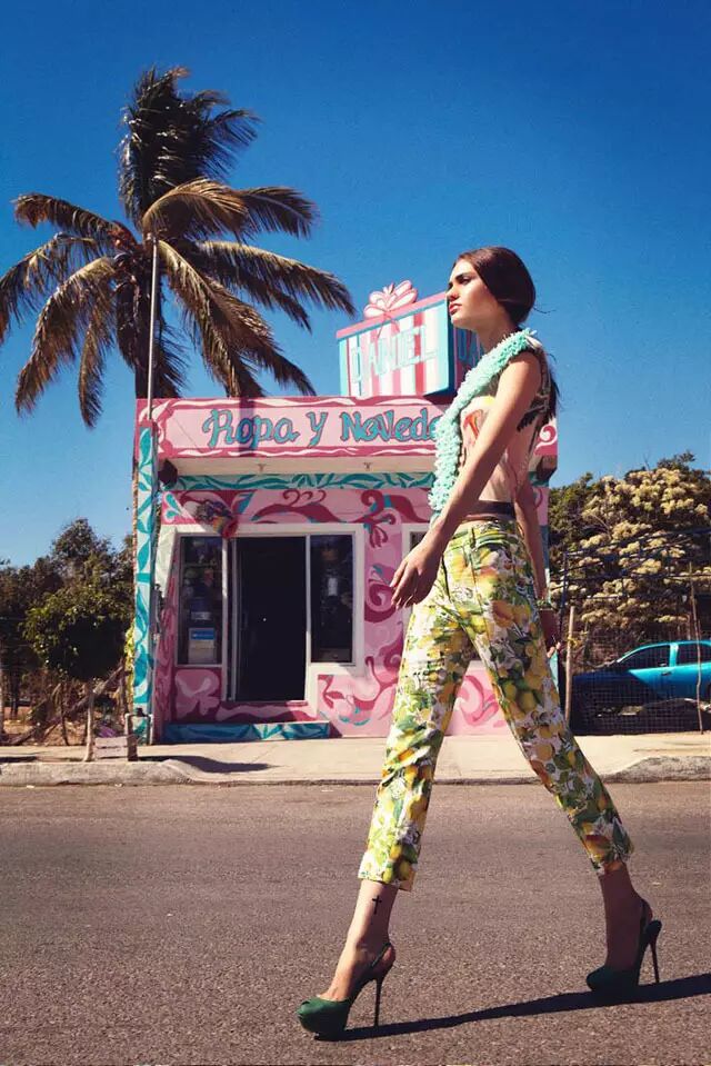 印花短袖+水果裤的搭配却不显得杂乱,反而与背景相映成趣,很有海滩的气息。准备去海边的姑娘们也可以这样穿。