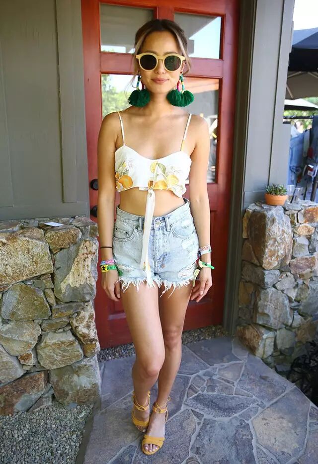 Paris Hilton的菠萝阔腿裤个性十足,搭配短top显得干练而又不失随性自然。