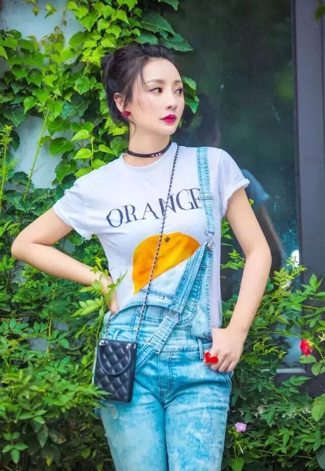 也许是背带裤挡着橘子太不耀眼,于是放下一边的背带,马上就变得俏皮起来了。