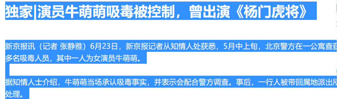 6月23日,网爆5月中上旬,北京警方在一公寓查获多名吸毒人员,其中一人为女演员牛萌萌。