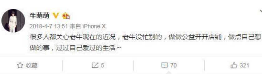 2018年,牛萌萌发布微博,暗示自己已经退圈。也表达了自己现在很不错。