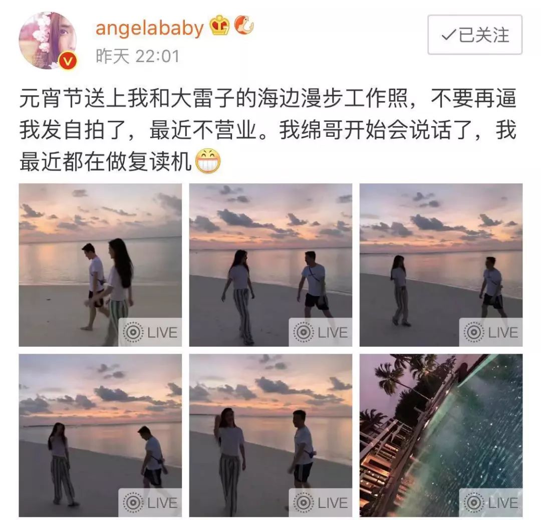 元宵节当天,Angelababy除了发九宫格工作照,还开心地向大家分享了一个好消息: