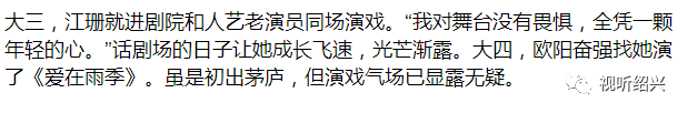 女儿曾问过江珊,妈妈,我上了大学你干吗去呀?江珊回答,我环游世界去。结果女儿逐渐长大,江珊却回到了炙爱的舞台。年轻时,大家把关注点都放在了她的美貌上。而相对忽视了她强大的演技。于是,这一时期,她又回归剧场,领衔演了话剧《守岁》《俄狄浦斯王》。