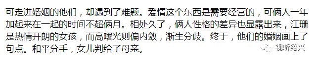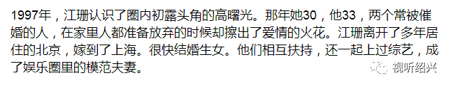 离婚的消息传开,引起了一阵轩然大波。不断有传言说某一方出轨或和别人暧昧不清,他们都在第一时间替对方澄清。高曙光说:“江珊是个很棒的女人,请大家别再用各种猜测去伤害她了。”即使不再是夫妻,他们依然维护着对方,“分手之后,我们把曾经相爱变成了美好记忆。”