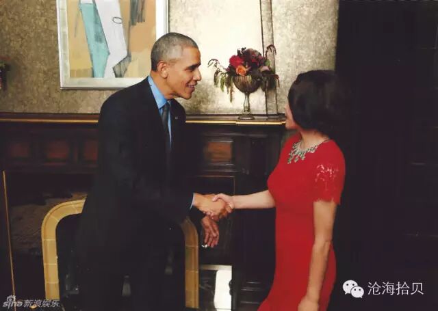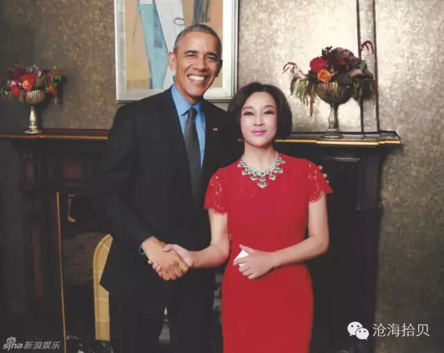 照片中,刘晓庆一身大红色古典修身裙端庄优雅,颈间的珠宝贵气十足,极富中国女性美,与奥巴马握手从容自信。奥巴马则用一只手轻轻揽着刘晓庆肩头,也笑得非常开心。