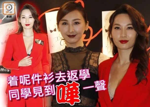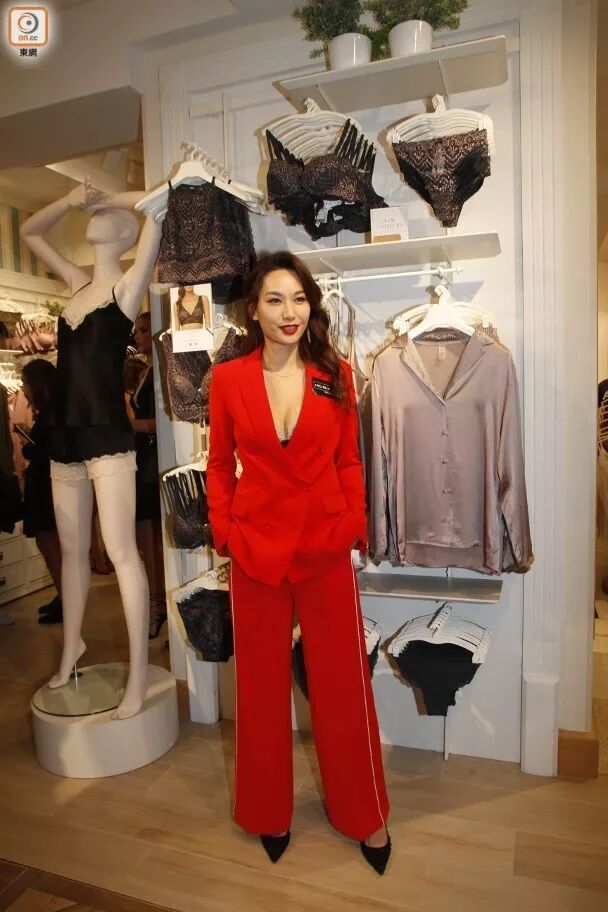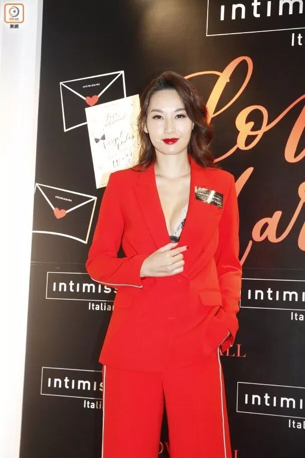 艺人徐子珊出席内衣品牌开幕活动,以鲜红色超低胸西装造型亮相,大晒3吋事业线,撼赢同场相对较密实嘅“34D咪神”高海宁!