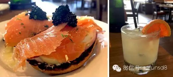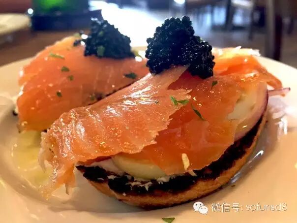 口感弹牙厚实的烟燻鲑鱼,上面豪气地放了一大陀鱼子酱,毫无腥味,味道非常鲜美,吃得到烟燻味,搭配涂着芥末乳酪起司的面包,风味独特,令人唇齿留香啊!