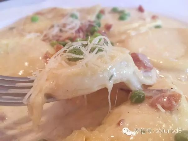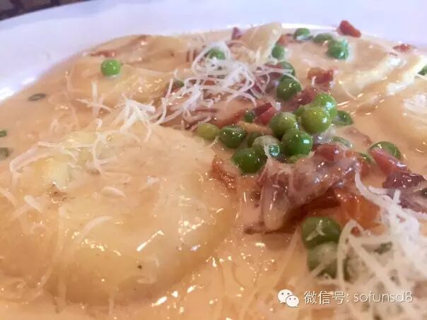 遥想当年初次见到 Ravioli时,只觉得一盘这么几颗饺子就要十几块钱也太坑人了吧!不过这几颗饺子里面可都包着沉甸甸的香浓起司,还吃不到一半就饱了呢。(当然免费的餐前面包功不可没啦!哈哈~) 香浓滑顺的奶油白酱配上帕尔玛火腿的香,让 KoKo 忍不住拿起面包沾来食用,不一会儿便盘底朝天,连白酱都清洁熘熘了呢!