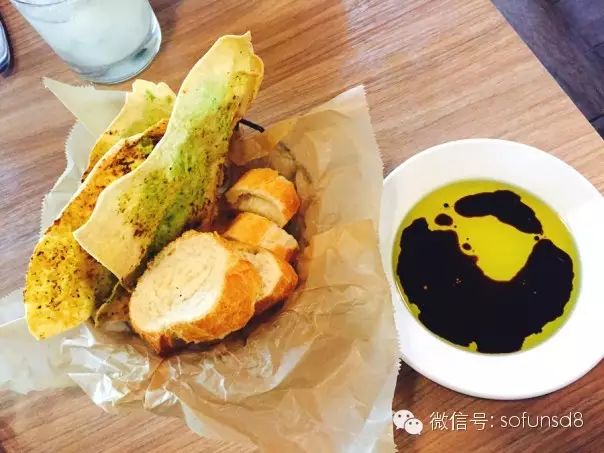 本以为来的会是 Pita 饼,结果出现薄饼与面包,薄饼香脆爽口,上面涂着薄薄一层绿色的香料,KoKo 说有香香的鱼腥味(什么东西?),我们吃完又追加了第二篮(免费续),面包外酥内软,沾着橄榄油的香气与酒醋的酸,令人胃口大开。
