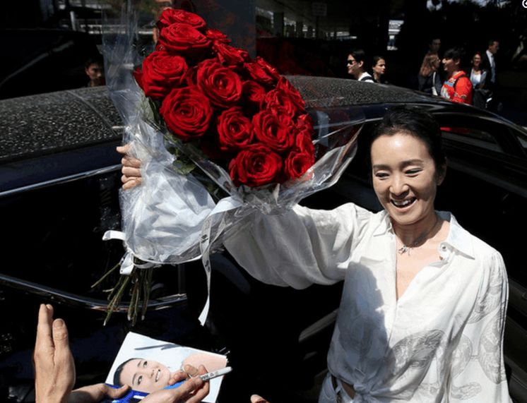 53岁的巩俐现身机场,很多外国的粉丝找她签名,并送上鲜花。
