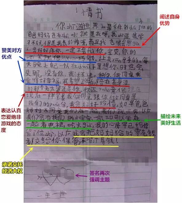小学高年级的孩子,文字和语言能力都比较完善,情书是标准三段式,运用大量的比喻、排比等修辞方法,成功率颇高!