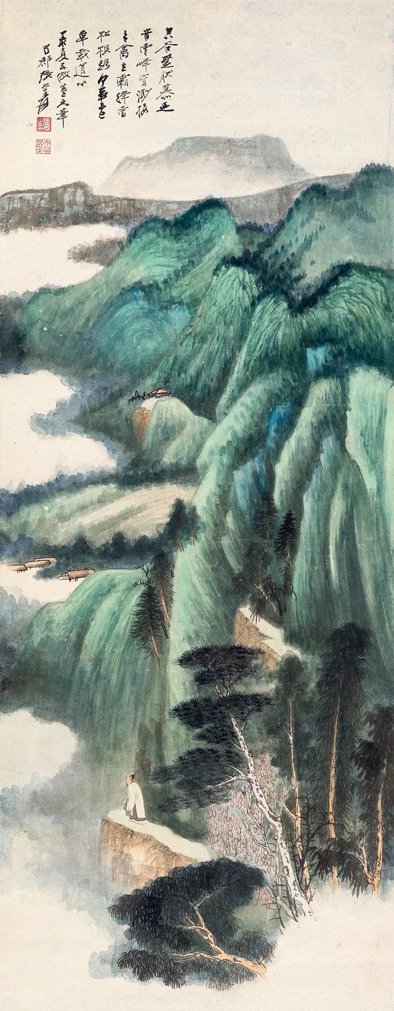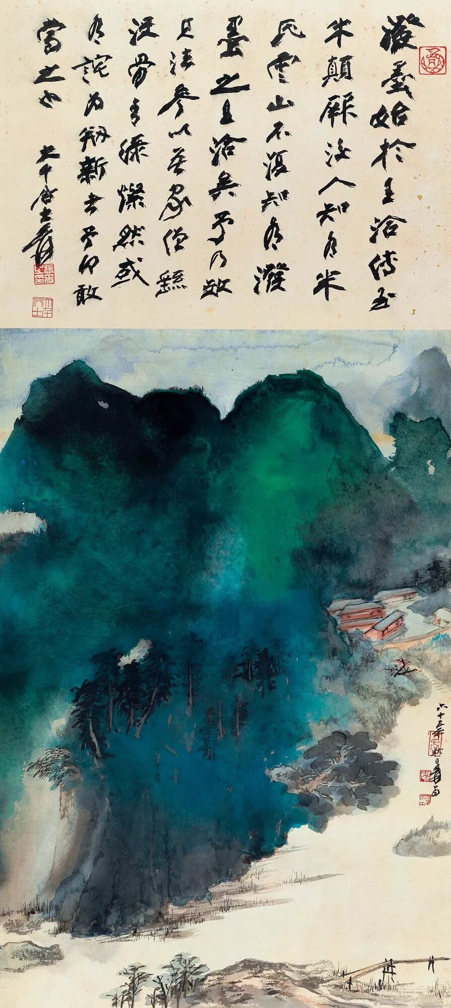诗 堂:泼墨始于王洽传至米颠,厥后人知有米氏云山,不复知有泼墨之王洽矣。予乃效其法,参以吾家僧繇没骨,青绿灿然,或有诧为剏新者,予何敢当之也?大千居士爰。钤印:丙辰、张爰之印、大千居士