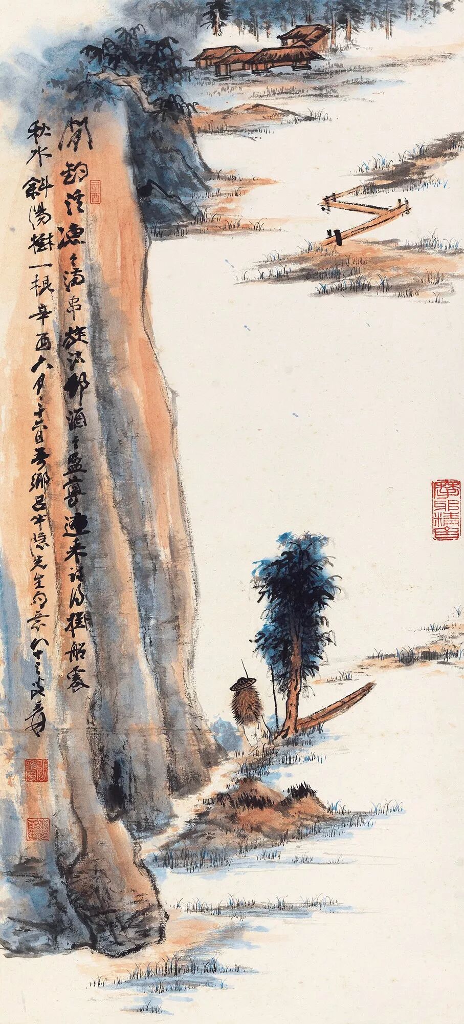 张大千早年在曾熙引导下,由“四僧”入手,刻苦研习,因此临摹功底极深。此画作于1944 年,乃张大千拟清渐江笔意绘之。渐江久居黄山,喜画奇松怪石,笔墨贵简。粗看渐江之画,渴笔淡墨尤似倪瓒,而纵观全局,则更近黄公望。对“四僧”研习多年的张大千自然对渐江的风格有着深刻的认识,因此在画上自题有云:“……渐江笔兼倪黄,故能于峬峭寓浑厚,后人但以迂翁法求之,剑去远矣。”寥寥数语,点明渐江画风之要义,使人受益匪浅。