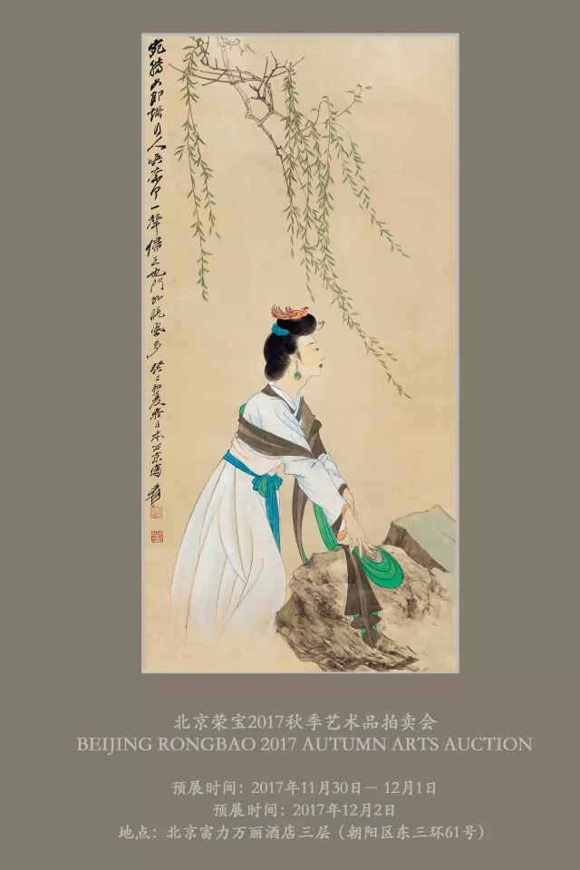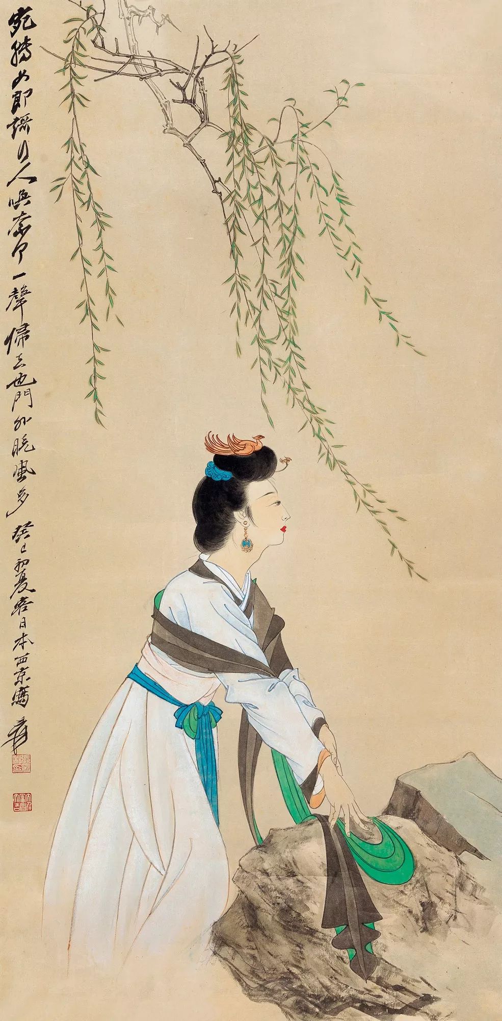 此件作品是张大千客居日本时所作。画中仕女侧身而立,抬头凝视前方,身体微微前倾,一手撑在身前石头之上,整个画面重心也落于此处。画面上方有柳枝垂落,随风吹起,为画面带来动感。仕女一袭白衣装扮,蓝色腰带、双色披帛于一派素净中增添了活泼生气。女子云鬓挽起,饰以凤钗、步摇、插梳,雍容华贵又不流于俗艳。画面线条匀称圆润,有高古游丝之意,衣饰皆细致描摹,面部与双手刻画得栩栩如生,更显深厚功力;设色颇具心思,青绿与白色的搭配尽显典雅,而一点朱唇又有“画龙点睛”之妙。