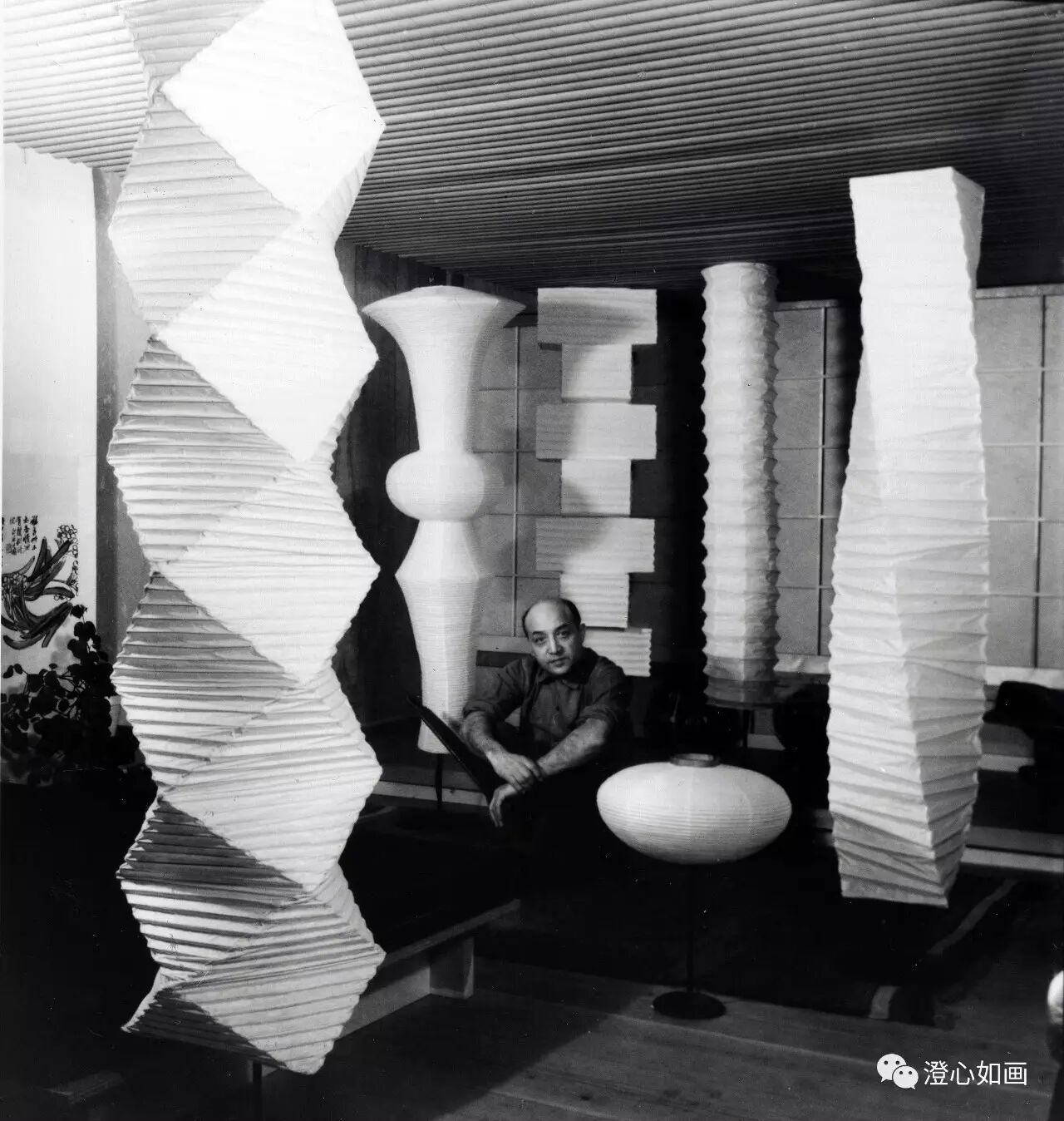 野口勇和Akari灯们,左边墙上挂着齐白石的画