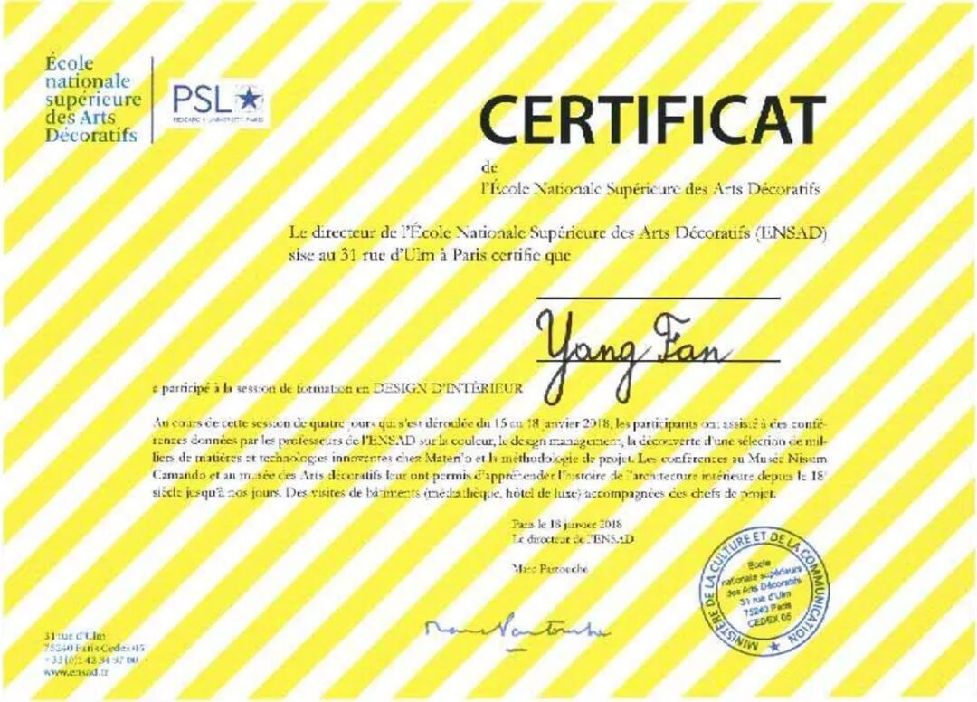 ▲巴黎国立高等装饰艺术学院为学员颁发结业证书