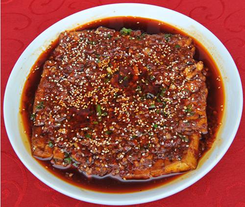 4.把豆腐块轻轻铲起,整齐拼放盘中,把余下汤汁淋在豆腐上,撒上芝麻、葱花、胡椒粉即可。