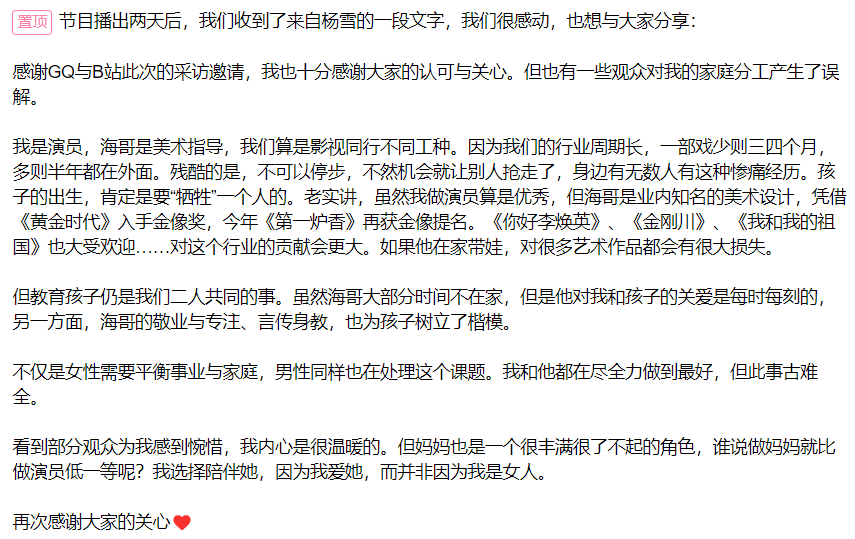 杨雪大概也听到了这些声音,在结束采访后,特地补充了一段表达。