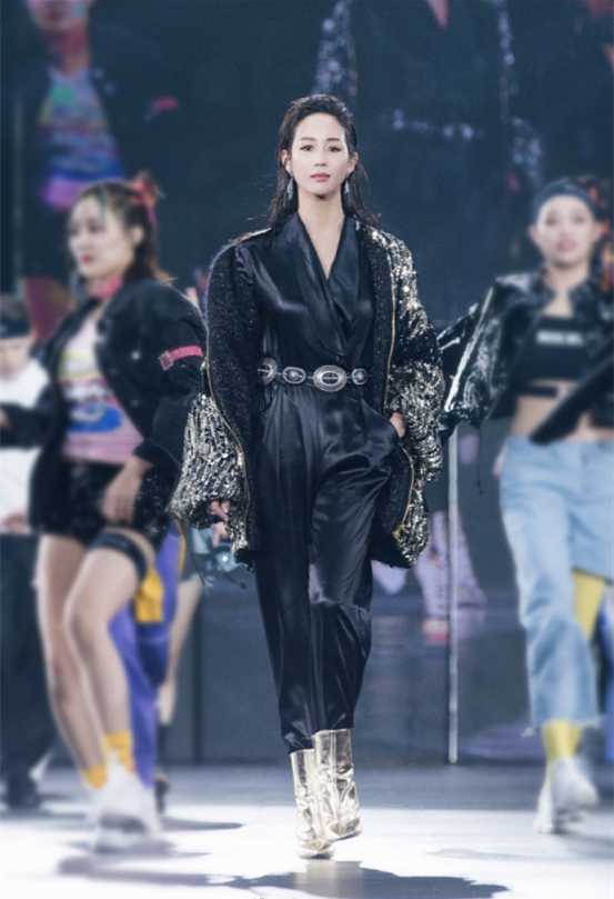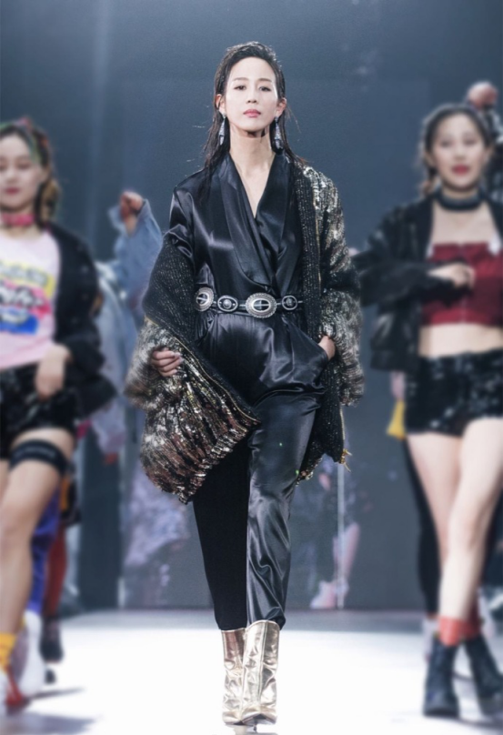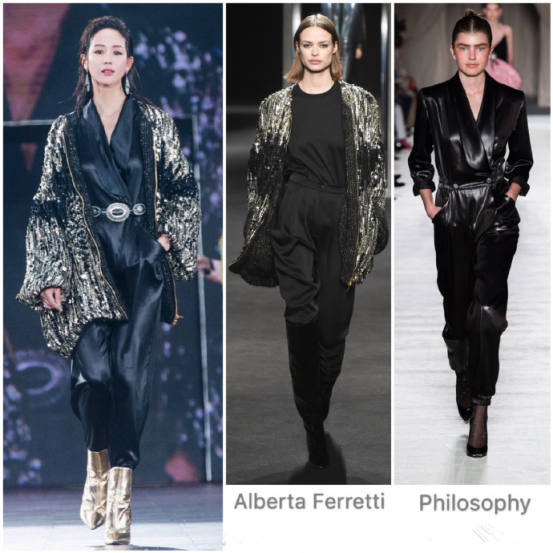 这身造型其实是两个模特的合一,连体裤是Philosophy的同款,而亮片外套是Alberta Ferretti的同款,作为两个元素的结合,张钧甯在台上的气场十足,就像霸气女王一样,把很多女星都比下去了,真的有点惊艳到小编了呢。