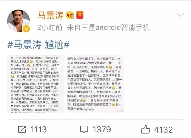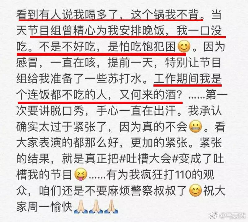 有人说他上台前喝高了,今天中午的时候,马景涛发微博澄清,因为怕录节目的时候犯困,他连饭都没吃,怎么可能喝酒。
