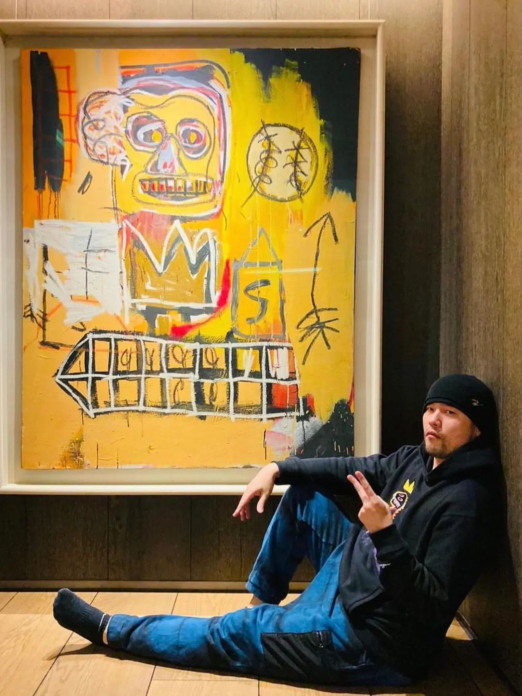 这次,周杰伦把照片中巴斯奎特曾坐过的椅子,连同画作一同带到拍卖会预展现场,摆出了相同的pose,表示致敬。