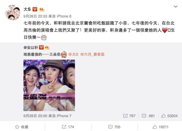 之后大S转发了安以轩微博,并配文称:七年前的今天,軒軒請我去北京蘭會所吃飯認識了小菲,七年後的今天,在台北周杰倫的演唱會上我們又聚了!更美好的事,軒身邊多了一個很愛她的人。生日快樂~