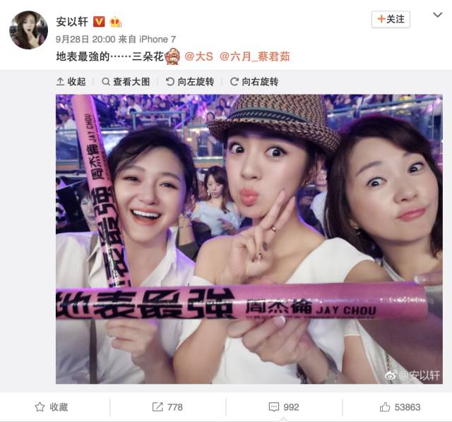 安以轩昨天天顺利登上热搜,倒不是因为自己的生日和婚宴,而是因为在微博上晒出和大S在周杰伦演唱会的自拍!从照片可以看出,安以轩一手拿手机,一手比V挡脸,嘟嘴卖萌,大S也拿着应援棒挡住小半边脸,笑得灿烂。