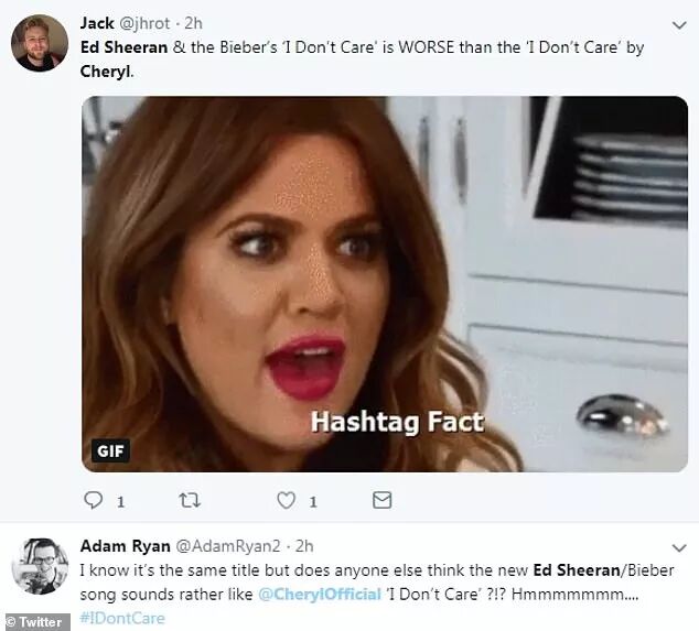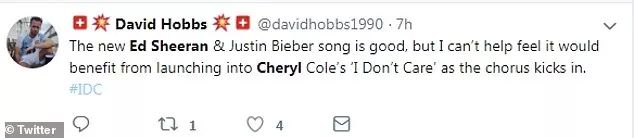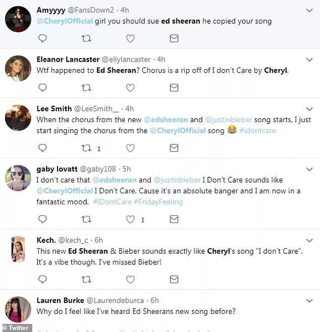 还有一位有网友说,当听到Ed Sheeran和Justin Bieber的《I Don't Care》副歌,我开始唱出了Cheryl的《I Don't Care》副歌。