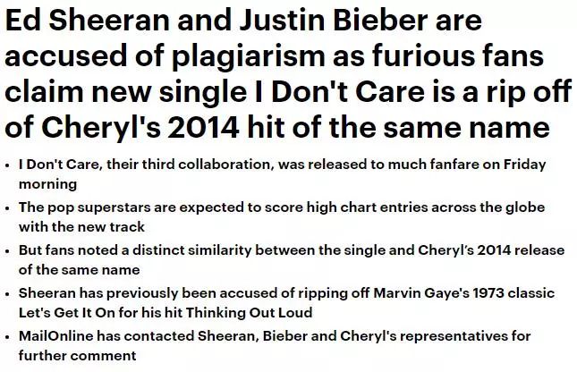 英国《每日邮报》还报道了这个新闻,新闻标题Ed Sheeran和Justin Bieber被指控剽窃,愤怒的歌迷声称《I Don't Care》抄袭了Cherly在2014年发行的同名歌曲。