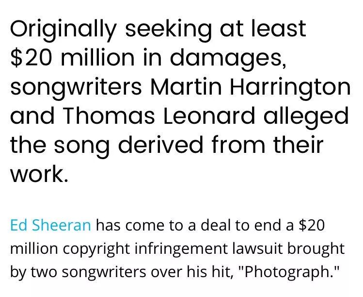 2014年Ed Sheeran推出的《Photograph》被控告抄袭了第七季《X音素》冠军歌手Matt Cardle在2011年推出的歌曲《Amazing》,遭到创作者状告法院,要求赔偿2000万美元。