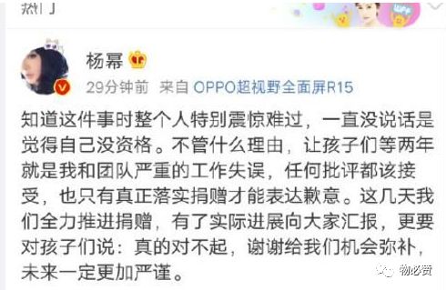 杨幂微博原文:知道这件事时整个人特别震惊难过,一直没说话是觉得自己没资格。不管什么理由,让孩子们等两年就是我和团队严重的工作失误,任何批评都该接受,也只有真正落实捐赠才能表达歉意。这几天我们全力推进捐赠,有了实际进展向大家汇报,更要对孩子们说:真的对不起,谢谢给我们机会弥补,未来一定更加严谨。