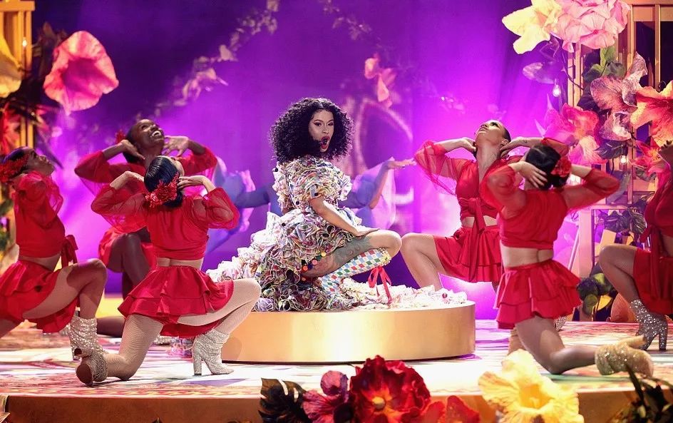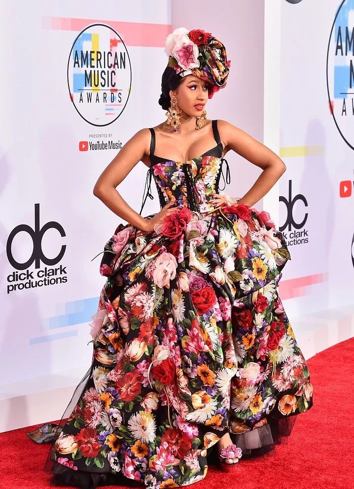 卡老师Cardi B 身穿印花长裙搭配礼帽,宛如一位热情的西班牙女郎,让人感觉她下一秒就会在红毯上高喊着“okuuuuur”并跳起弗拉明戈。