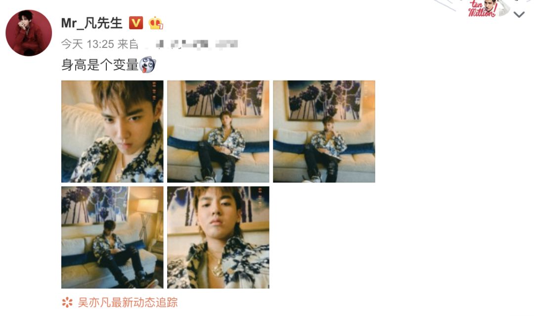 歪个楼,因为拍摄角度问题,吴亦凡的红毯照一度引起大家对于他的身高和身材比例的争议,凡凡还专门发了一条微博晒出自拍,回应称“身高是个变量”,大长腿依旧,粉丝们可以安心了~