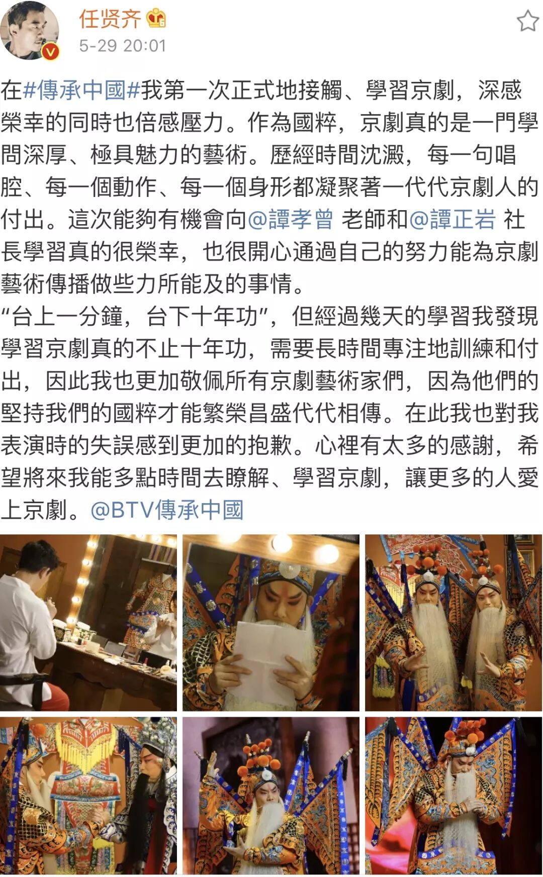随后对表演艺术家的表示佩服,并对自己的失误道歉,称:“‘台上一分钟,台下十年功’,但经过几天的学习我发现学习京剧真的不止十年功,需要长时间专注地训练和付出。”
